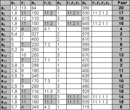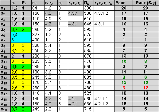 ![]() аi – автомобиль, пj – одна из четырех ходовых характеристик (объем двигателя, мощность, привод, грузоподъемность). Направления оптимизации всех признаков – максимизация. Пусть приоритеты признаков следующие: объем двигателя (п1) – 1, мощность (п2) – 2, привод (п3) – 2, грузоподъемность (п4) – 4. Табл. 1 иллюстрирует пошаговое применение алгоритма многомерной сортировки. На первом шаге осуществляется сортировка по признаку п1 (объем двигателя). Полученные ранги показаны в столбце r1. Несколько объектов получили уникальные ранги, но общая сортировка нестрогая. Неразличимые на первом шаге ранги выделены, они бдут детализированы далее. На втором шаге (сортировка по приводу) уникальные ранги получают ранее неразличимые объекты a20 и a5, а четыре объекта, получившие на первом шаге 11 ранг, разделяются на две группы неразличимых объектов. Сортировка по признаку п3 (привод) не вносит в ранжировку никаких изменений. Окончательная строгая сортировка получается только на последнем шаге. Для удобства рассмотрения алгоритма в примере ранги объектов на каждом шаге не пересчитываются, а детализируются дополнительным рангом (через точку). Пересчет рангов в привычную шкалу производится после окончания работы алгоритма. Таблица 2. Многомерная сортировка с уступкой