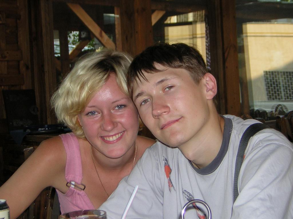 Кафе было совсем рядом с метро, и оказалось отличным и приятным местом - небольшие деревянные домики с открытыми окнами. Это вполне соответствовало нашей мечте после долгого катания на метро в жаркий день - вот только холодного пива бы ещё...:) Благо, в "Сим-Сим" нашлось и это! (хорошо, что Лужники далеко оттуда :))